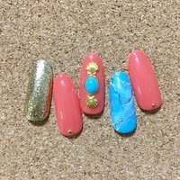 ターコイズ コーラルピンクのネイルデザイン ネイルブック